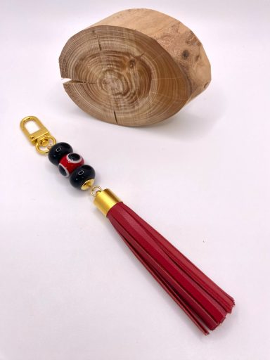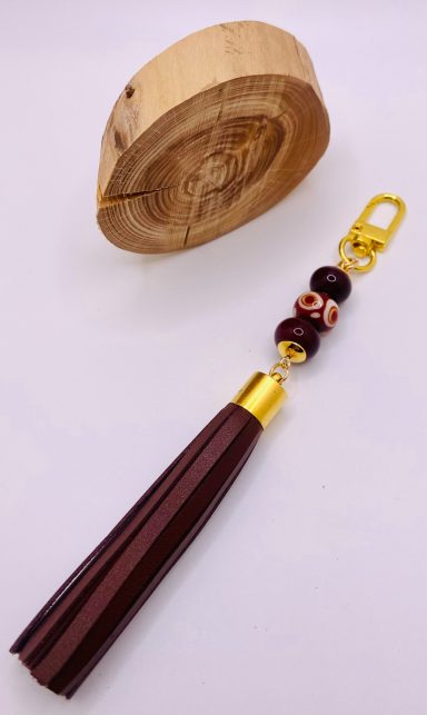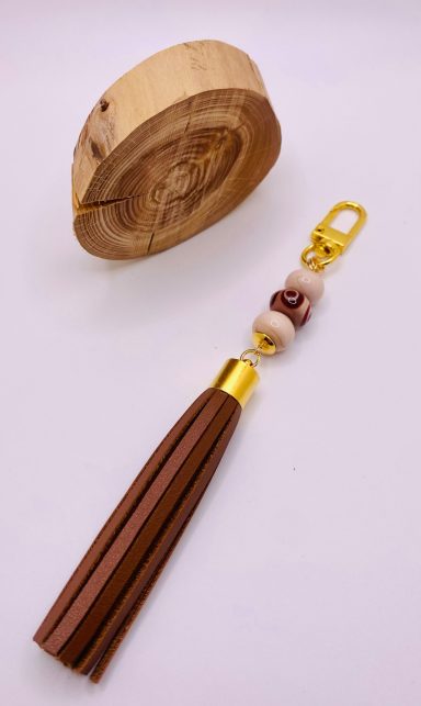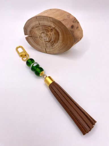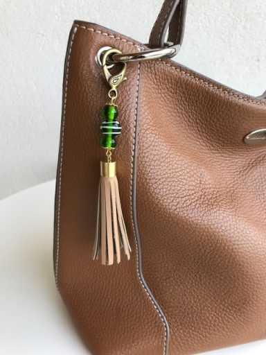 Les perles en verre de Murano sont mises en valeurs avec du cuir véritable afin de créer un bijou qui pourra être suspendu à un sac à main pour le personnaliser.