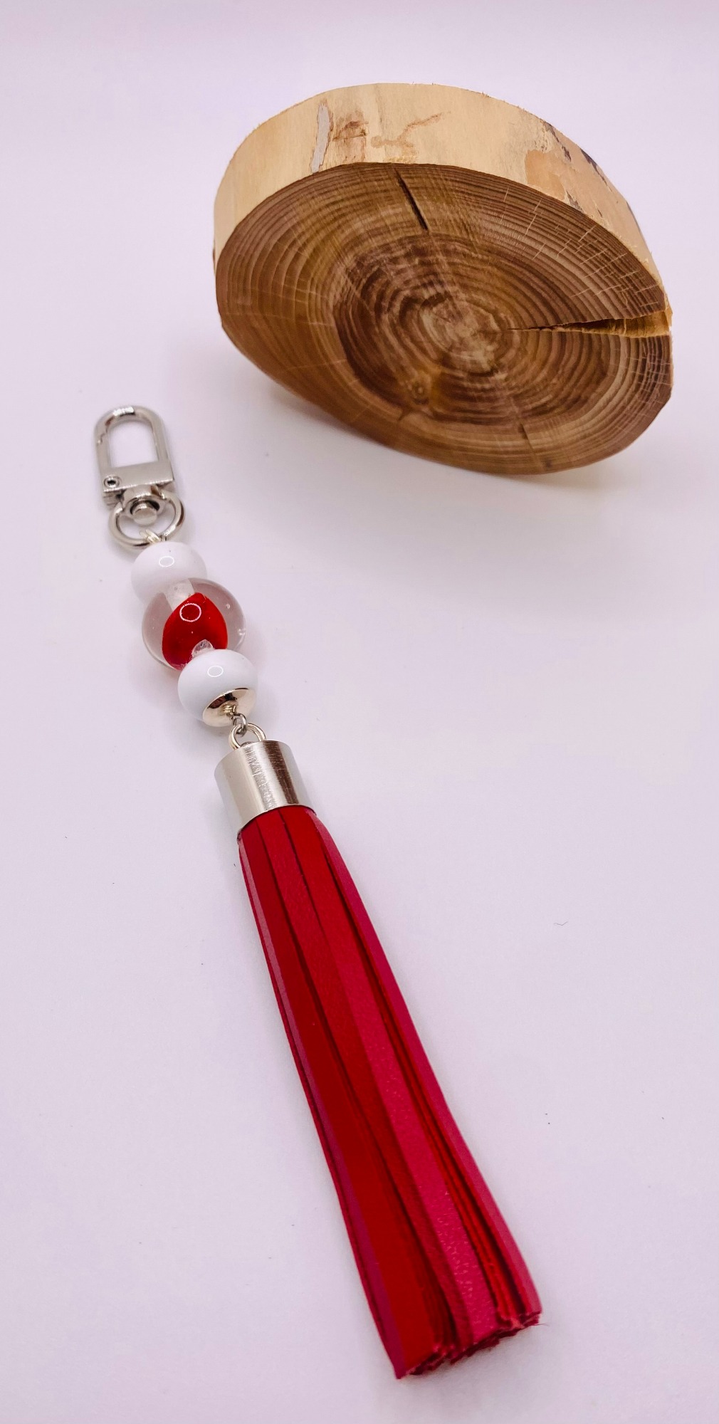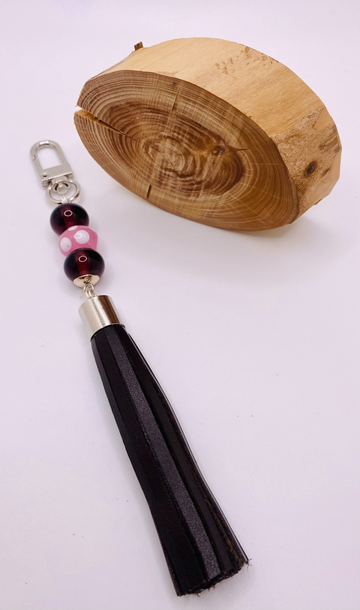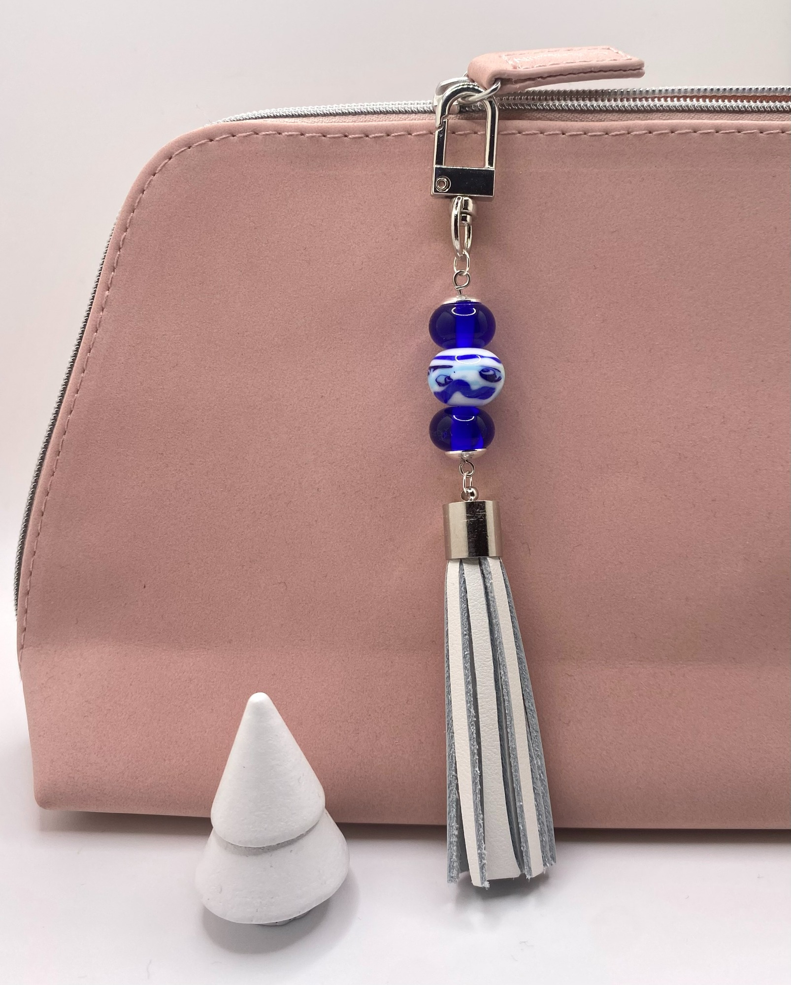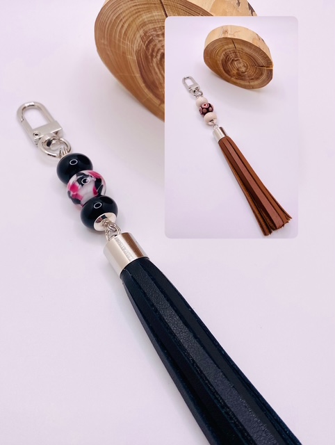 Les perles en verre de Murano sont mises en valeurs avec du cuir véritable afin de créer un bijou qui pourra être suspendu à un sac à main pour le personnaliser.