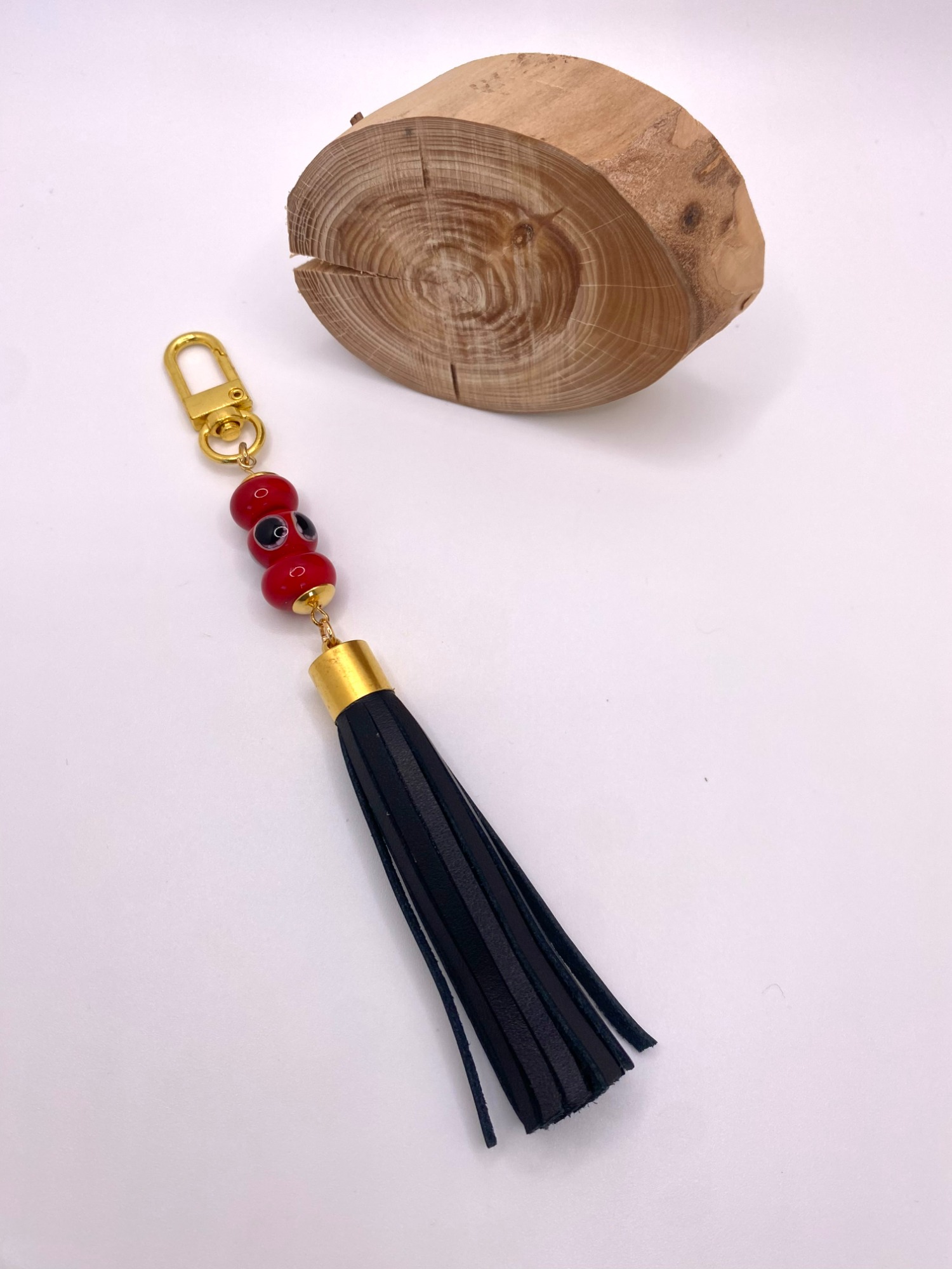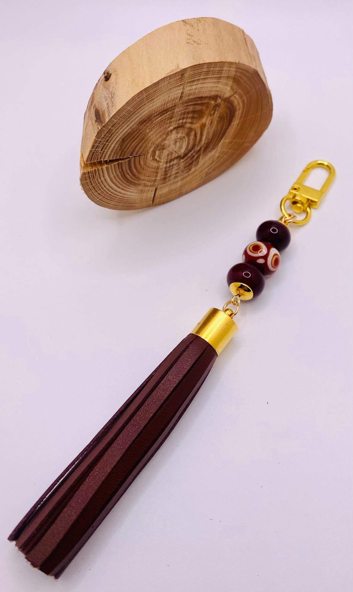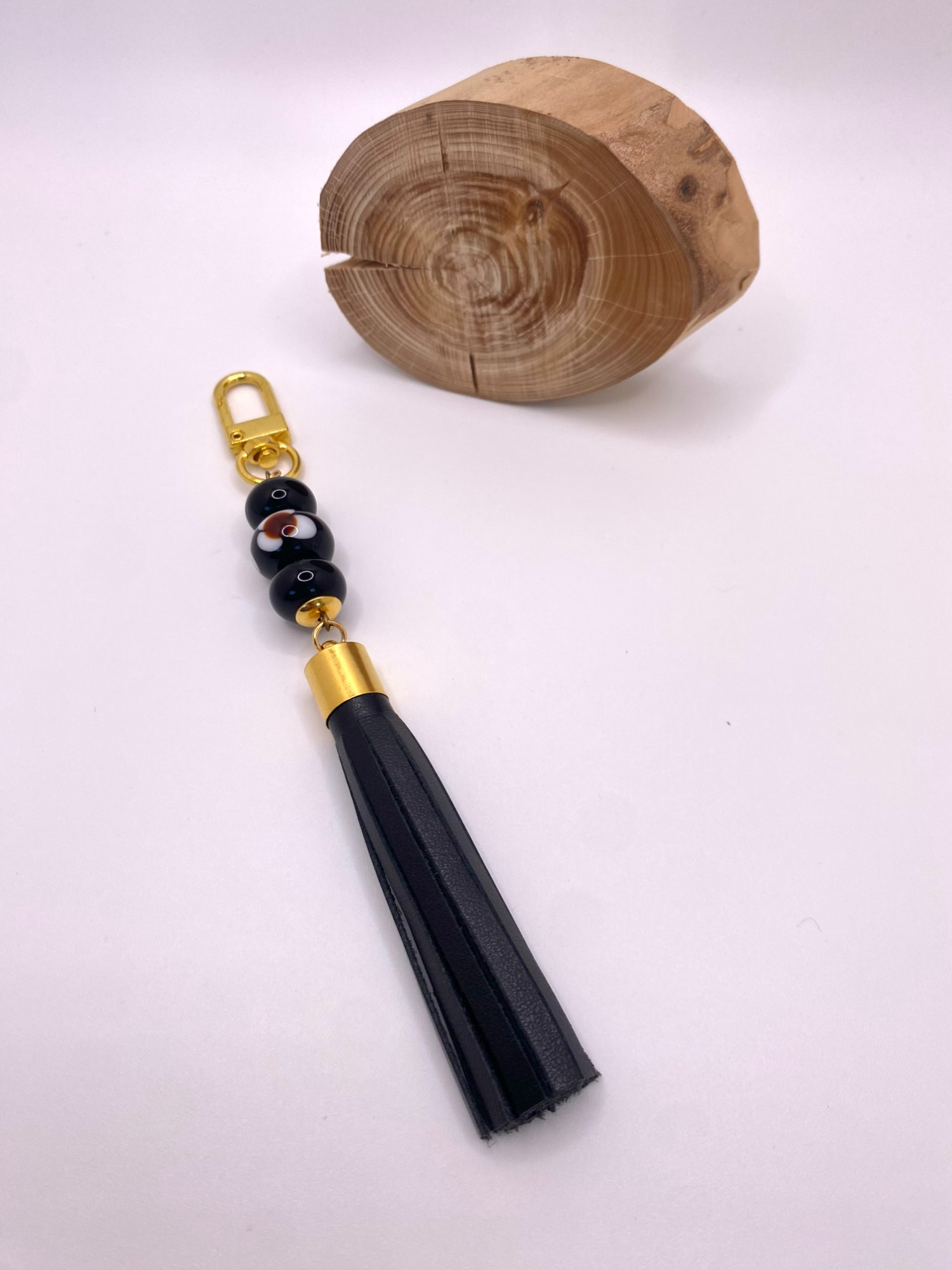 Les perles en verre de Murano sont mises en valeurs avec du cuir véritable afin de créer un bijou qui pourra être suspendu à un sac à main pour le personnaliser.