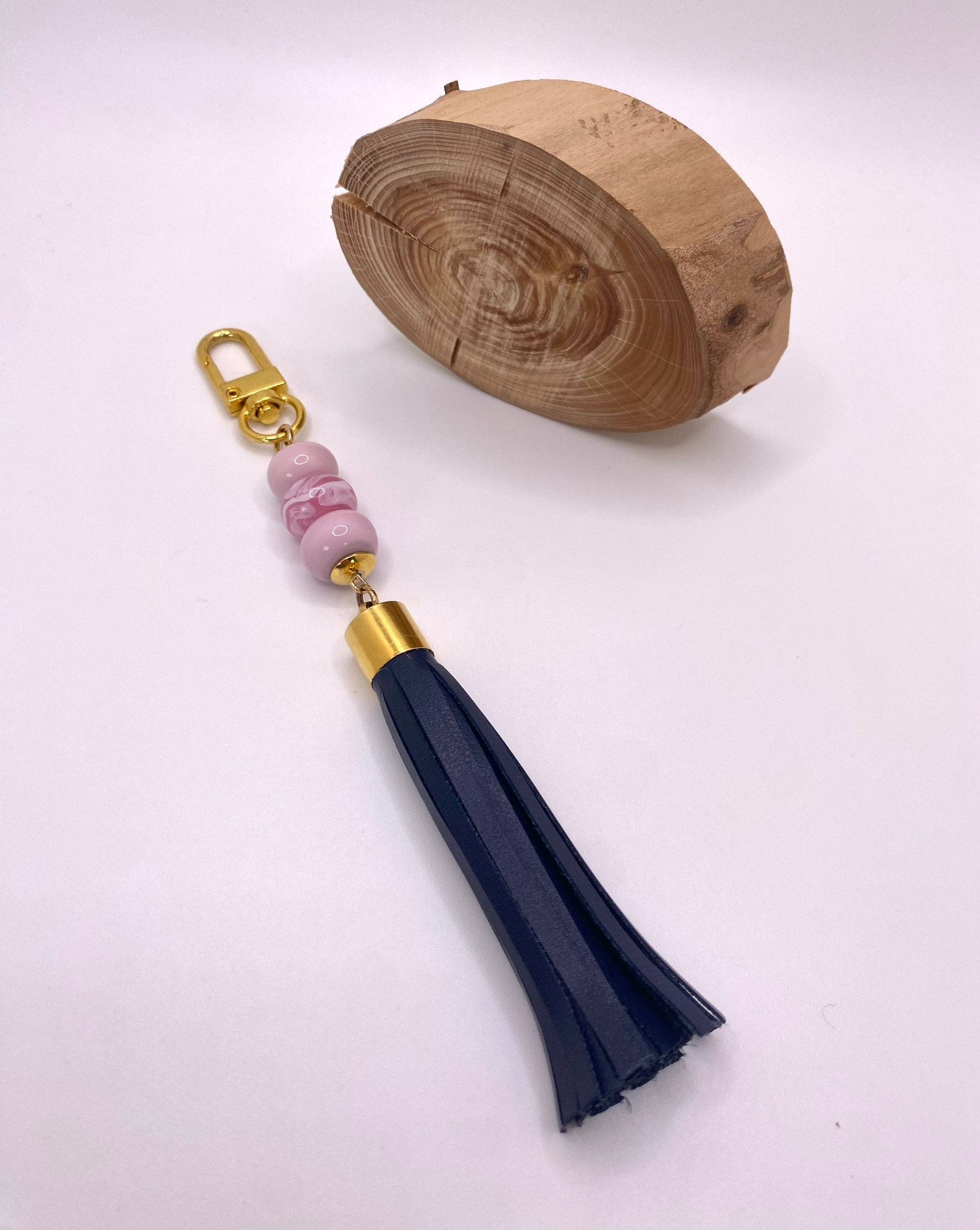 Les perles de verre et le pompon en cuir sont montés sur des apprêts en argent ou doré.